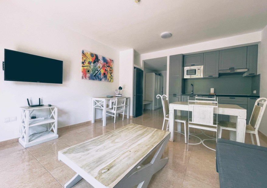 Antiguo complejo turístico llamado Papagayo. Nuestros huéspedes tendrán acceso a una piscina con tumbonas y sombrillas. También hay un bar junto a la piscina en la residencia.  Es el lugar ideal para aquellos que quieren alejarse de la vida caótica y relajarse durante sus vacaciones. A las afueras de la residencia hay bares, una pizzería y el supermercado Hiperdino Express. Aproximadamente a 1 km de distancia se encuentra el popular centro comercial Il Campanario, donde encontrará un supermercado bien surtido, tiendas, una farmacia, bares, restaurantes y mercados con productos locales y artesanías. Se puede llegar al centro de Corralejo en 15 minutos, con su zona peatonal repleta de tiendas, discotecas, heladerías, restaurantes y pubs con discotecas. Nuestra recomendación es definitivamente alquilar un auto para visitar la isla. Algunas plazas de aparcamiento están disponibles fuera de la residencia o se puede aparcar a lo largo de la carretera. Un piso en una residencia con piscina es una excelente opción para quienes buscan un alojamiento cómodo y relajante.  Nuestros pisos disponen de un dormitorio con dos camas individuales, un salón con cocina americana, un cuarto de baño con ducha y un balcón. Un piso está situado en la primera planta y el otro en la planta baja. Los interiores están amueblados con gusto y atención al detalle para crear un ambiente acogedor y hogareño. La cocina está equipada con todo lo necesario para preparar comidas, mientras que el salón ofrece un cómodo sofá y un televisor para relajarse después de un día explorando la isla.