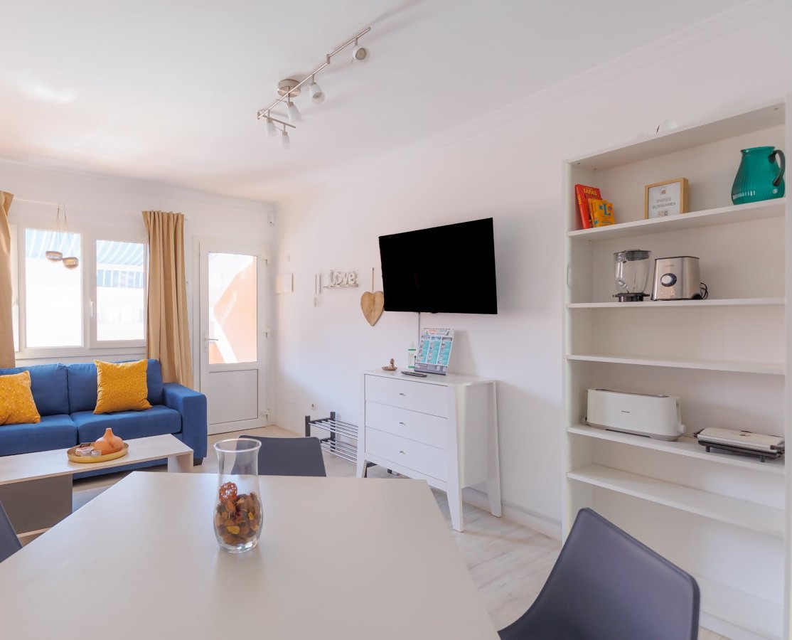 El interior está amueblado con gusto y atención al detalle para crear un ambiente acogedor y hogareño. La cocina está equipada con todo lo necesario para preparar comidas, mientras que el salón ofrece un cómodo sofá y un televisor para relajarse después de un día explorando la isla.